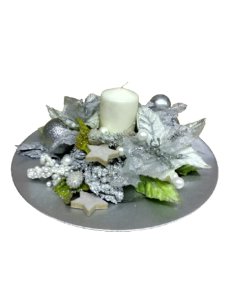 Centrotavola natalizio color argento con candela e decori. |
